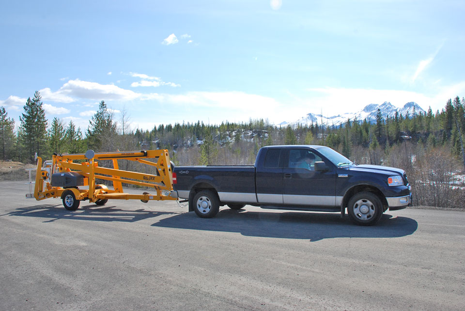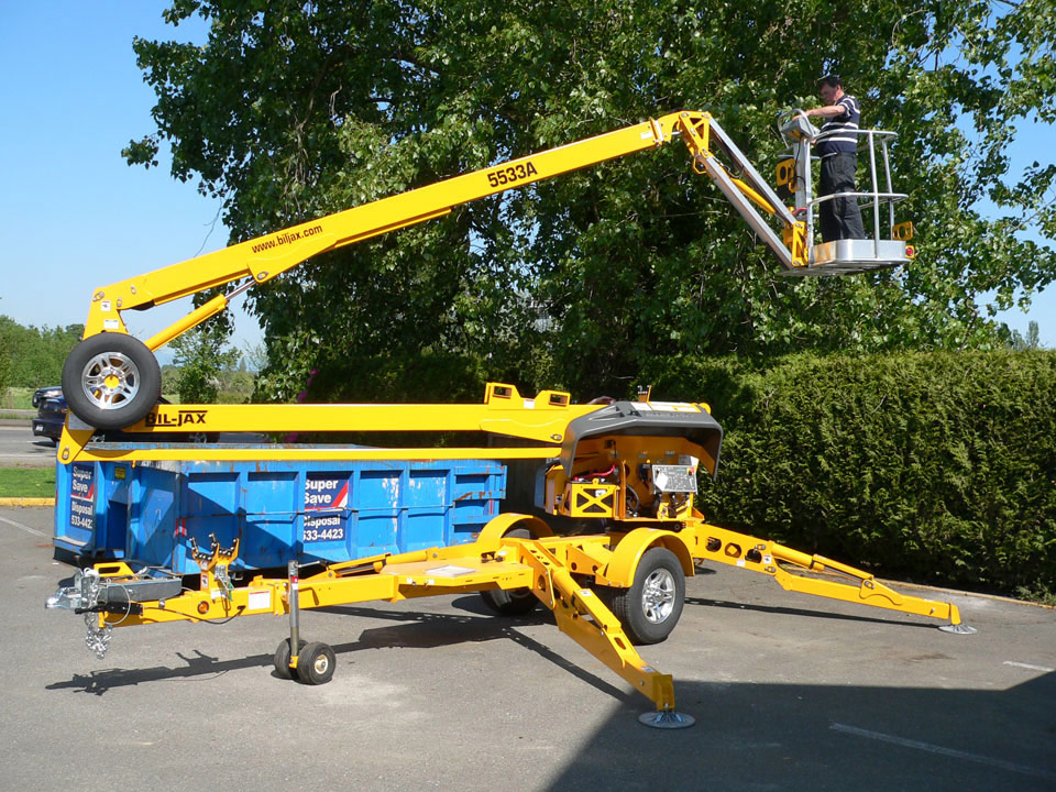 Our trailer-mounted boom lift provides 61' of working height, 33' outreach, and additional 23 'extension.